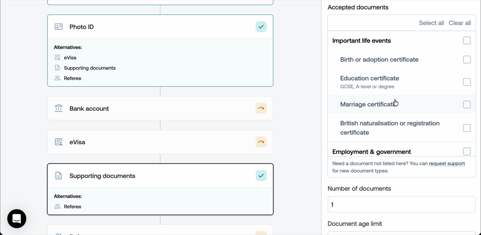 From the Vouchsafe dashboard, go to Flows and open your preferred verification flow in the builder, and check out the expanded range under Supporting documents.
